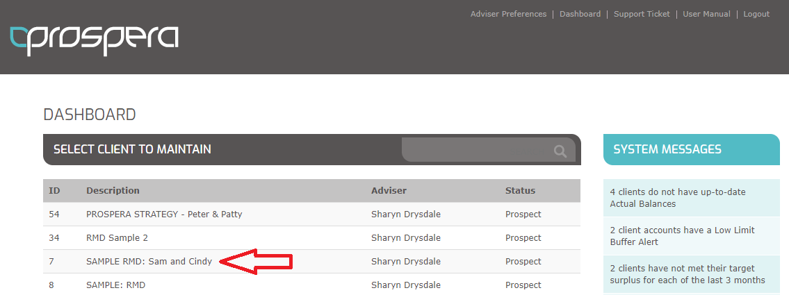 1. Select the Prospera Client you wish to link to their Moneysoft data.